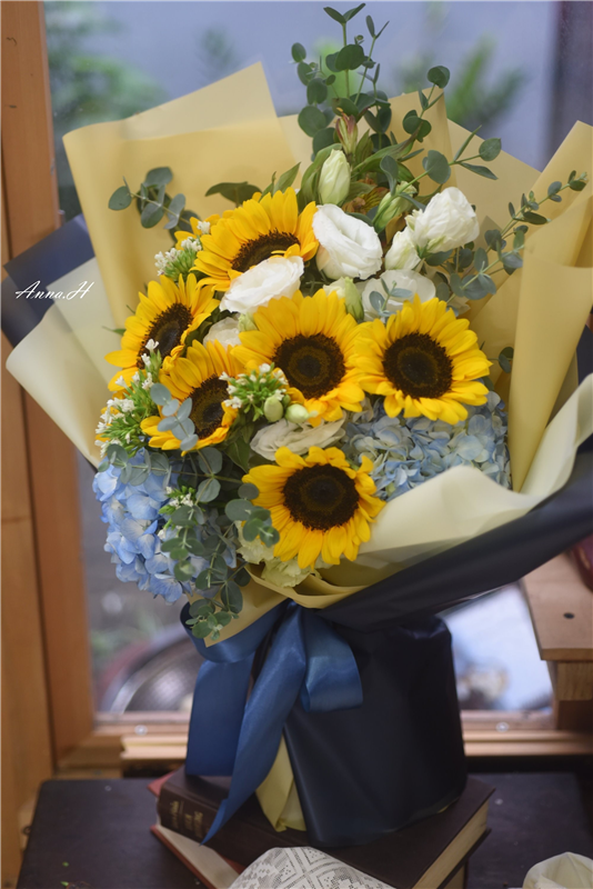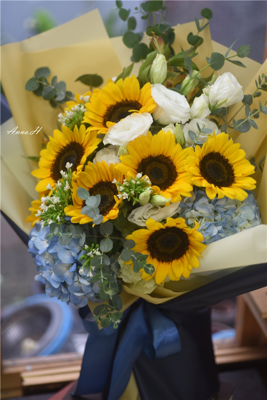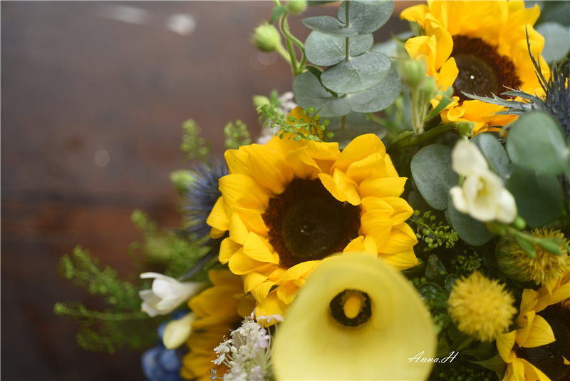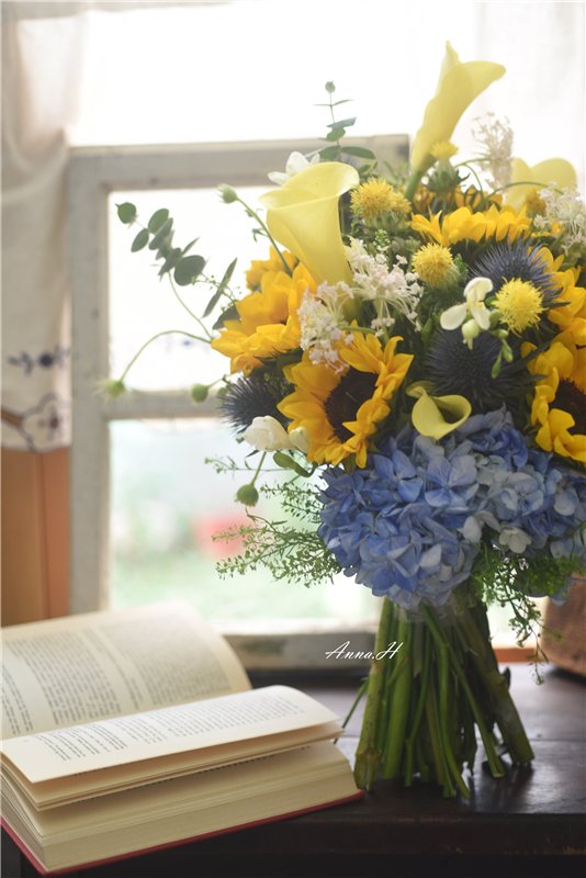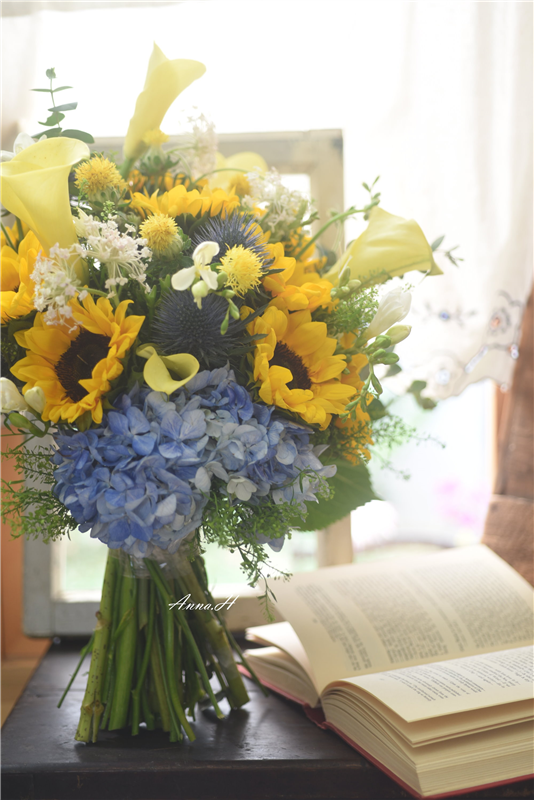 花材:繡球、向日葵、小蒼蘭、翠珠、尤加利葉、綠鈴草、海芋。